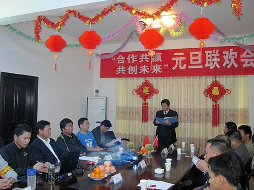 20091231日下午,湛江钢铁工程场地平整项目经理部四楼会议室张灯结彩,火红的灯笼高高挂起,在喜庆的中国结的映衬下,印有“‘合作共赢,共创未来’元旦联欢会”的横幅显得分外耀眼。