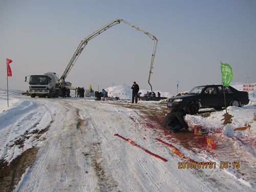 开工以来,由于蓬莱地区连降大雪,施工现场坡陡路滑,给施工带来极大困难,蓬莱项目部全体员工为了兑现对业主的承诺,攻坚克难,抢抓工期,施工按计划有序推进。元月一日早上915分,第一个风基基础的浇灌在11号风机基坑上准时浇灌,8辆混凝土搅拌车穿梭不停地将混凝土从20公里以外的搅拌站运到工地,坡陡路滑就用装载机牵引上山,经过连续13个小时的浇灌,一个Φ18.5×3m共计419 m3 的风机基础浇灌成功。为了保证质量,除了在混凝土内添加了防冻剂外,还在基础内预置了测温仪探头,定时测温,确保混凝土温差达到规范要求。并在混凝土表面覆盖四层保温材料,做到防冻万无一失。