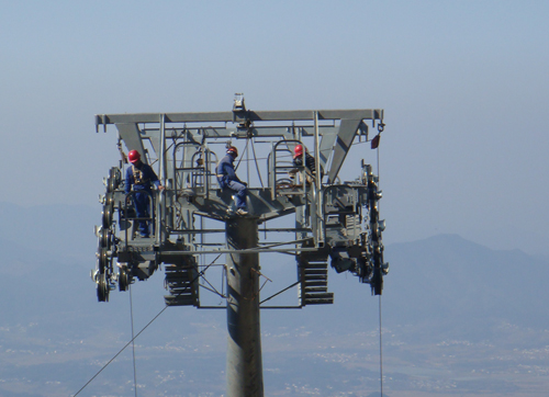 2009年初进入工地以来,在项目部的组织下,参战的机电公司员工顶风冒雪在悬崖峭壁间树立起施工临时索道塔架。为确保土建工期员工们发扬连续作战的精神,冒着酷暑24小时作业为土建运输材料。特别是从8月下旬设备正式安装开始,为保节点,参战员工发扬“敬业 忠诚 团结 进取”的企业精神,克服重重困难进行设备的运输以及安装工作,通过不懈努力在12月初完成上下站机电设备安装,线路塔架及托压索轮的安装工作,交外方进行编绳和设备调试工作。