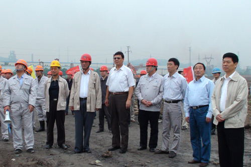 928上午,十七冶马钢高速车轮技改工程工地,彩旗飘扬,四只硕大的气球牵浮着四条巨幅标语,在工地上空飘荡,大型吊车矗立在现场,一派隆重热烈的气氛。