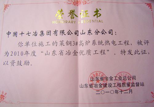 日前,山东省冶金工业总公司颁布了2010年度山东省冶金行业优质工程评选结果,由十七冶山东分公司承建的莱钢3#高炉系统热电工程获“山东省冶金优质工程”奖。张赛、吴海华、谭伟钢、董仲锋和周中军五名同志获“优质工程突出贡献奖”。