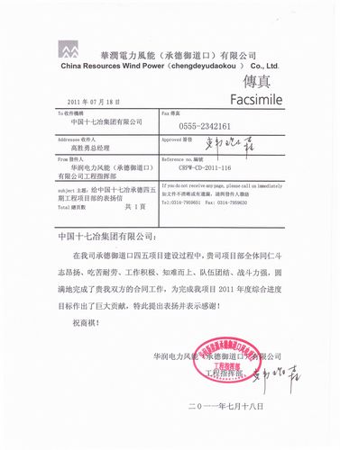 风电公司受华润电力风能(承德御道口)有限公司表扬