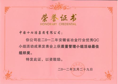 日前,从安徽省冶金工业协会和安徽省建筑业协会QC小组成果发布会上获悉,中国十七冶集团荣获2012年省冶金行业 “质量管理小组活动最佳组织奖”称号,受到大会表彰。