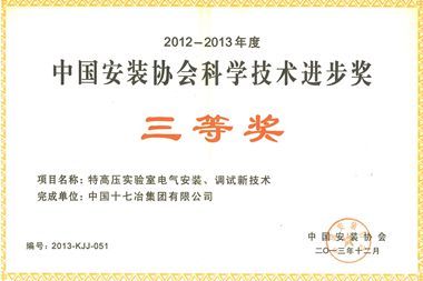 获得2012-2013年度中国安装协会科学技术进步奖的分别为公司信息化部完成的《基于物联网的安全绳佩戴状态远程监测系统》和冶金工程技术公司完成的《特高压实验室电气安装、调试新技术》。这2项科学技术进步奖的成功获得,充分体现了公司对科技创新工作的高度重视、广大技术人员过硬的专业技术水平以及十七冶人为推进公司可持续发展的持续创新精神。