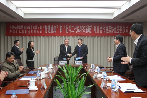 15,中国十七冶集团与中通安徽智慧城市投资有限公司在公司总部签订“智慧城市”和北斗二代“GAPS”项目合作框架协议。中国十七冶集团董事长、党委书记喻世功,中通安徽智慧城市投资有限公司董事长王文祺分别代表合作双方在协议上签字。