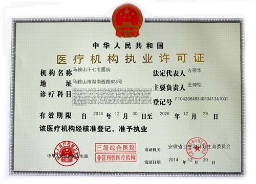16,马鞍山十七冶医院从安徽省卫计委捧回了三级综合医院医疗机构执业许可证,正式成为国家三级综合医院,这也是中冶集团第二家三级综合医院。