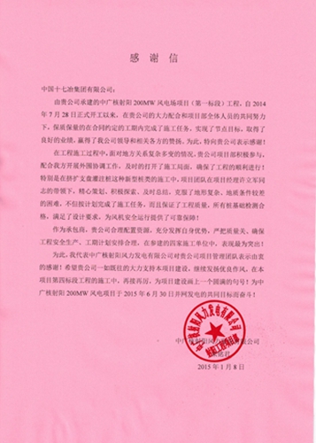 近日,中广核射阳风力发电有限公司项目部致信中国十七冶集团,衷心感谢十七冶风力与太阳能发电工程技术公司在射阳风电项目一标段工程施工中,保质保量完成施工任务,如期实现了节点目标,在参建的四家施工单位中,表现最为突出。