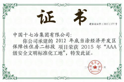 116,由中冶置业(安徽)公司承建的当涂经济开发区保障性住房二标段工程荣获国家“AAA级安全文明标准化工地”称号,中国十七冶集团连续四年有项目获此殊荣。