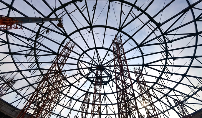 最新监测数据表明,综合管的滑动支座径向和环向位移最大值为21毫米,满足设计限值50毫米的要求;支座最大转角为0.01rad,满足0.02rad限值要求;穹顶结构控制点竖向位移最大为69毫米,与设计理论值吻合;穹顶结构对称点竖向位移最大差值为9毫米,远小于20毫米限值要求。所有对称位置索力均匀分布,穹顶结构整体稳定性良好,为接下来穹顶之上金属屋面及之下30吨斗屏的安装创造了极为有利的条件。