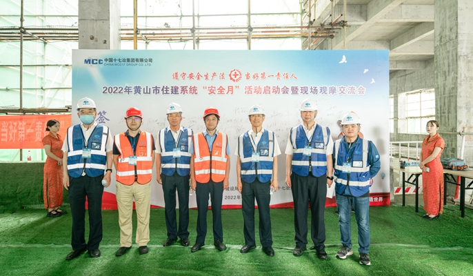 6月21日上午,黄山市住建局在中国十七冶集团有限公司市政工程技术分公司承建的黄山市中医药传承创新中心项目隆重举行了2022年黄山市住建系统“安全月”活动启动会暨现场交流观摩会。黄山市建筑管理处主任程钢,副主任张先波,中国十七冶集团副总经理伍昌国,安全监督管理部副部长魏宁,市政分公司党委副书记高胜勇、副经理邢献平和黄山市各区县住建局、建管办,企业负责人等共近200人出席本次活动。
