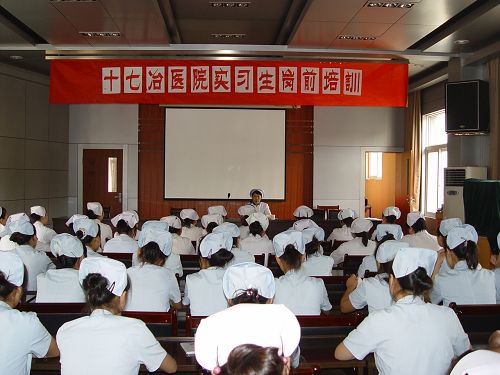 72,十七冶医院对来该院实习的100余名护士进行岗前培训。为了使这批即将踏上工作岗位的学生尽快转变角色,提高服务意识。十七冶医院对她们进行了护士服务礼仪、护士服务操作、医疗质量、医疗安全、法律知识等方面进行了专门培训,从而使这些学生学到了许多在学校里未能学到的知识,为他们将来走上工作岗位打下较好的基础。