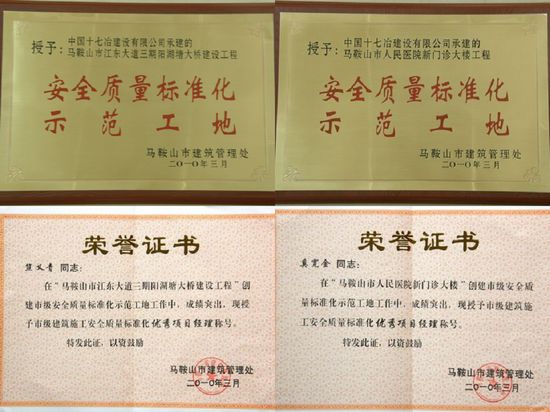 日前,马鞍山市建管处对2009年度安全质量标准化工地进行了表彰,十七冶工程管理公司承建的马鞍山市江东大道三期阳湖塘大桥工程及人民医院新门诊大楼工程获得 “2009年度市级安全质量标准化示范工地”的荣誉称号。