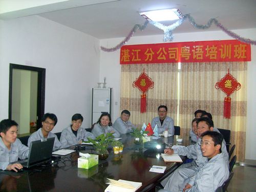 培训采用播放幻灯片和学习视频等方式,系统学习了粤语和普通话的发音区别、粤语日常会话基础。学员们一丝不苟的跟着视频一字一句的学习,情景对话促进学员对粤语的掌握,现场气氛十分热烈。此次培训活动旨在让广大员工更好的融入当地语言环境,方便日常工作和生活,促进对外沟通与交流,为即将启动的湛江钢铁项目做准备。