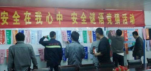 项目部全体管理人员、作业队负责人、安全员共计80余人踊跃参加竞猜活动。“小小谜语阵、大大安全责”,大家争相竞智、驻足静思,桥二队安全员率先猜出谜语“不按曲谱弹琴(词语)”的谜底“违章操作”;紧接着路基三队安全员抢先猜出“塞北女人称孤道寡(词语)”的谜底“安全”……,竞猜活动在紧张有序而热烈的气氛中进行,120余条安全谜语仅两个小时尽被逐一猜破。活动为大家上了一次生动的安全文化教育课。