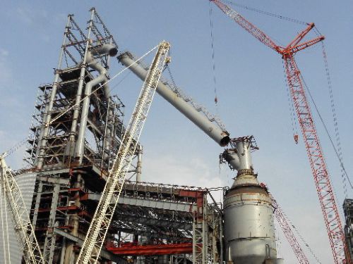 728下午1818,吉钢2#高炉下降管顺利就位。至此,高炉本体大型钢结构安装全部结束。