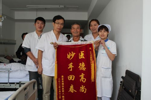919,老人因患贲门癌住进了胸外科,刘德荣主任亲自为他主刀手术。手术后的第三天,患者忽然发起高烧,整整三个夜晚,刘主任都陪护在患者病床边,观察病情,及时为老人治疗。在刘主任的精心治疗下,老人痊愈了。出院前,老人紧紧握着刘主任的手说,不知道怎么感谢他,只有送面锦旗表达感激之情。