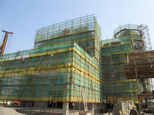 金浩•仁和天地一期工程总建筑面积125101.32m2,地库总面积25000m2,包括9栋高层住宅和1座售楼部。售楼部为框架结构三层,局部六层,主厅高度8.4m,斜屋面顶坡度近60度,造型复杂。按照业主售楼部必须在11月7日交付装修的要求,项目部全体员工发扬了“高效严谨、精细务实”的企业作风,科学组织施工,从9月11日土方开挖到结构封顶,只用了不到两个月的时间。