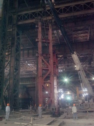 马钢根据转炉炼钢扩容需求,决定在原有厂房内新增一台精炼真空炉,并增加2根高44m1.8m的巨型实腹钢柱。此次吊装的下柱重39t,由于在厂房内施工,吊装条件受到限制。项目部根据现场情况多次召开方案评审会,确定了最优的吊装方案,决定对钢柱分3段进行吊装。吊装前,机装五处对钢柱焊接了对接平台、设置了安全防护装置,仔细检查了吊装索具,并对吊车进行空载试杆,确保了钢柱安全顺利地吊装。