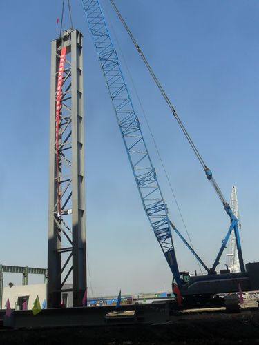 此次吊装的钢柱下柱重约49吨,标高28.3m,杯口基础-2.9m。为确保此次钢柱的顺利吊装,项目部精心组织和准备,对履带吊站位、回转半径、提升高度、吊臂是否卡杆进行了精确的计算,确保钢柱吊装工作顺利完成。