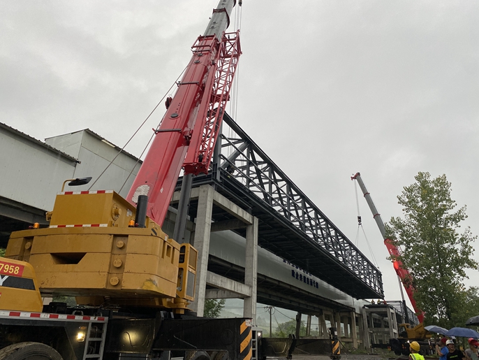 5点30分,随着信号工一声令下,吊装正式开始,两台汽车式起重机顺利将钢桁架提升0.5米左右,试吊结束后信号工指挥起重机司机平稳抬升钢桁架。两台起重机配合默契,抬升、平移、抬升,整个过程一气呵成,最终经过一个半小时,跨353国道50.5米钢桁架准确就位,吊装顺利完成。上万高速弋阳出口和姚畈村中断路段提前两小时恢复通行。