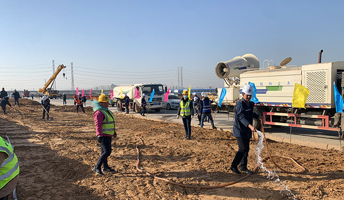 在扬尘治理行动中项目部组织专人铺设防尘布、架设喷淋等,设立环保监测点和环保专员,号召全体作业人员种植树木、清扫道路,严格践行扬尘治理八个百分百要求努力营造绿水蓝天的生态环境。此次种植活动的开展,也是项目部应对冬季施工和扬尘管控的有效措施,最大限度依靠植物的天然养护能力治理扬尘。