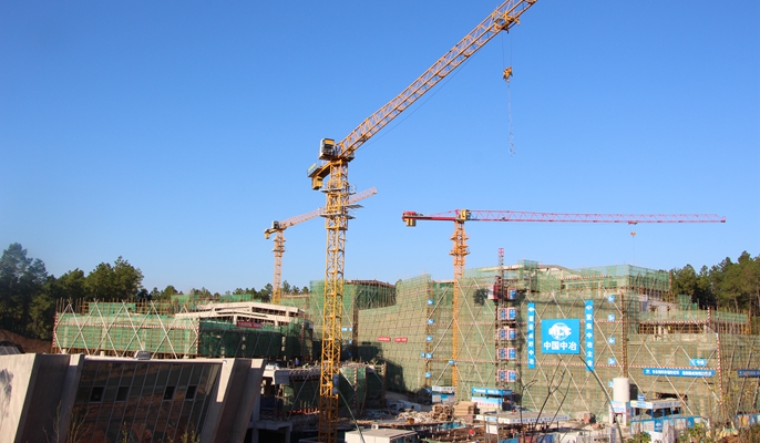 景德镇艺术职业大学A区工程项目位于江西省景德镇市珠山区景德镇北站北侧,总计三个组团,其中F组团艺术设计酒店总建筑面积43430平方米,地上27105平方米,地下16325平方米。工程共有五个单体分为公共区和客房区,公共区建筑层数4层,建筑高度16.75米;客房区建筑层数6层,建筑高度23.95米。五个单体依山而建、背靠山体,现场场地狭小,只有一条主路运输材料。