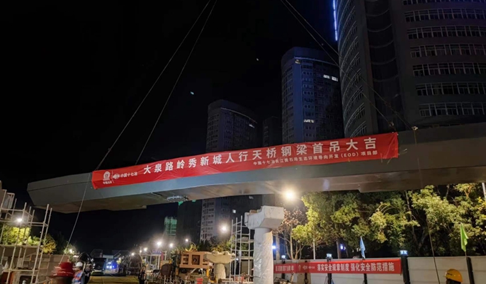 10月20日晚,由中国十七冶华中分公司承建的黄石市大泉路生态廊道领秀新城人行天桥钢梁首吊顺利完成,标志着施工建设取得初步成果。