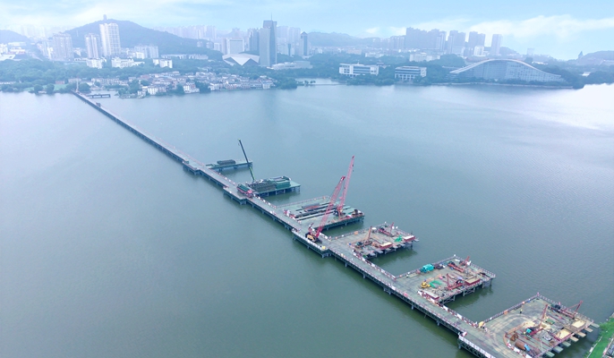 磁湖绿色廊道工程位于黄石市中心城区,全长约1.5公里,规划在磁湖南侧修建一条长约0.85公里的跨湖大桥,将沿湖路-磁湖大桥-苏州路全线打通,从路网结构上看,将形成一条与杭州路平行的东西向贯通性道路,实现团城山和磁湖南片区的直接快速联系,有效引导磁湖南片区的土地开发和产业发展。此次贯通的钢栈桥是磁湖大桥配套桩基施工平台,主栈桥总长822米,宽度6米,最大跨径为12米,共有16个水中墩,各墩分别设置支栈桥及钻孔平台。