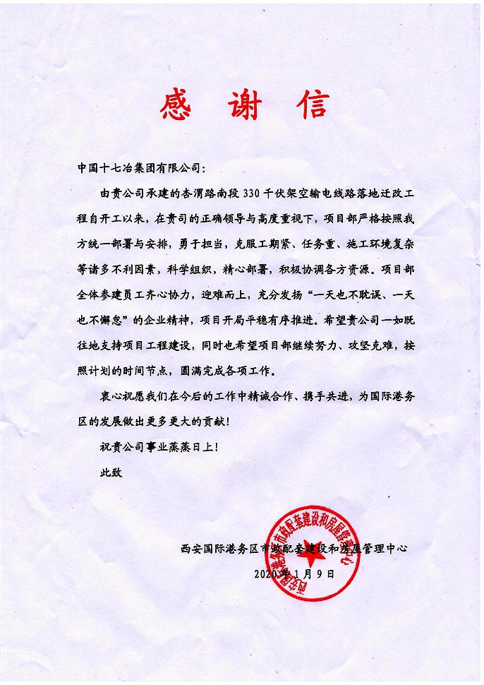 19日,中国十七冶集团收到西安国际港务区市政配套建设和房屋管理中心发来的感谢信,对路桥工程技术分公司承建的西安东北部330KV架空线路落地迁改电缆工程杏渭路(北三环-潘骞路)电缆隧道工程取得的进展表示衷心感谢。