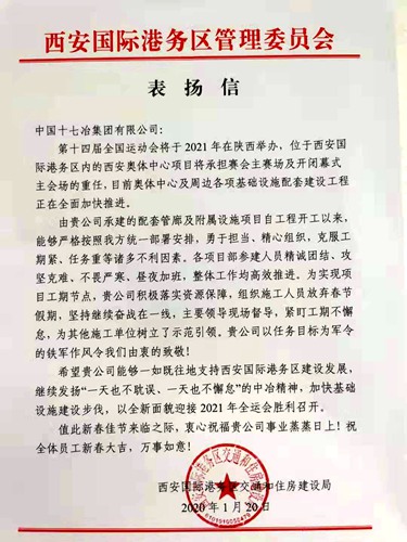 1月22日,中国十七冶集团收到西安国际港务区交通和住房建设局发来的表扬信。