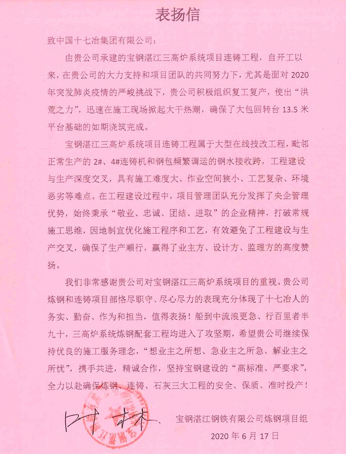 6月19日,宝钢湛江钢铁有限公司炼钢项目组向中国十七冶集团发来表扬信,对中国十七冶集团冶金工程技术分公司宝钢湛江钢铁连铸项目部积极推动工作有序开展、按期完成施工任务提出表扬。