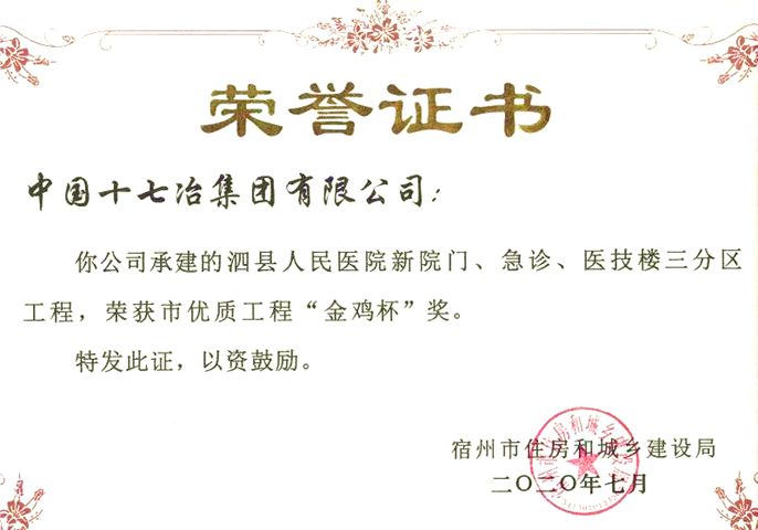 “金鸡杯”优质工程奖是宿州市建设行业工程质量最高荣誉奖。此次荣誉的获得,是对十七冶工程建设质量的高度肯定,提升了十七冶在宿州地区的核心竞争力,为进一步开拓宿州市场创造了有利条件。
