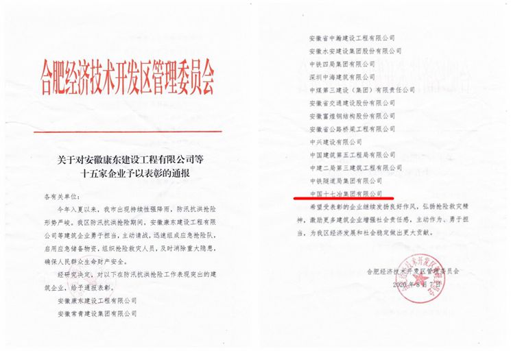 8月7日,合肥经济技术开发区管理委员会印发文件,表彰了包括中国十七冶集团在内的十五家企业,对在抗洪抢险行动中,勇担重任,主动作为,为促进合肥经开区的发展和社会稳定做出的巨大贡献表示感谢。