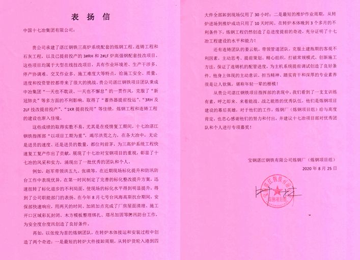 8月25日,中国十七冶集团收到来自湛江钢铁炼钢厂发来的表扬信,对冶金工程技术分公司在宝钢湛江钢铁三高炉系统项目建设过程中的努力拼搏和辛勤劳作表示赞扬与感谢。