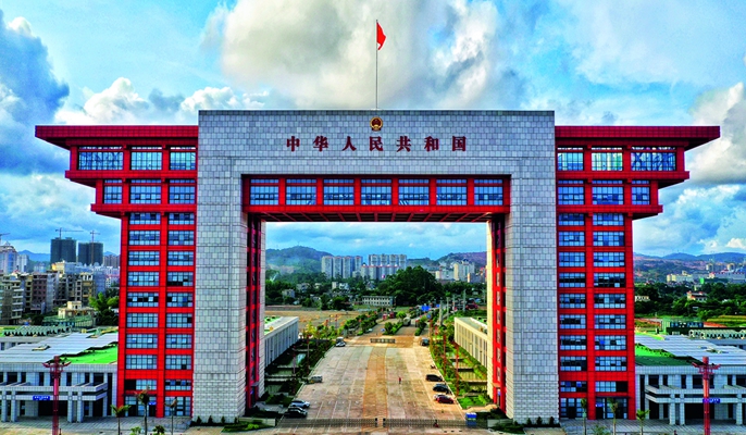 东兴口岸二桥综合服务区项目是广西沿边对外开放的重要形象工程,中国东兴—越南芒街跨境经济合作区的标志性工程,位于中越北仑河公路二桥中方桥头,项目包括国门楼、标准厂房和友谊大道等工程,主体工程国门楼位于中越北仑河公路二桥中方引桥桥头,项目规划用地面积172.6亩,总建筑面积5万多平方米,包括联检大楼1栋,配套建设广场、绿化、道路、停车场、围网、连廊等附属设施。其中国门楼东西方宽110米,南北方进深28.6米,最大高度68米,跨度60米,集国门形象展示、口岸联检、综合办公等多项功能于一身,是中国沿边陆路口岸最高、最长、面积最大的口岸国门。