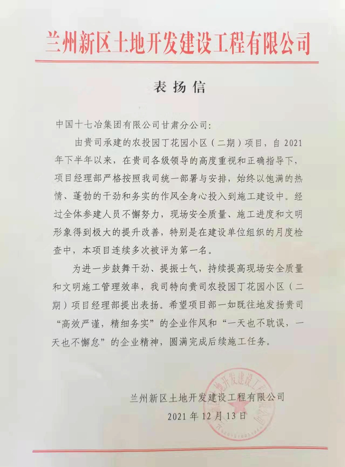 表扬信指出,农投园丁花园小区(二期)项目部严格按照建设单位统一部署安排,始终以饱满的热情、蓬勃的干劲和务实的作风全身心投入到施工建设中,在建设单位月度检查中,多次被评为第一,特向中国十七冶集团甘肃分公司提出表扬。