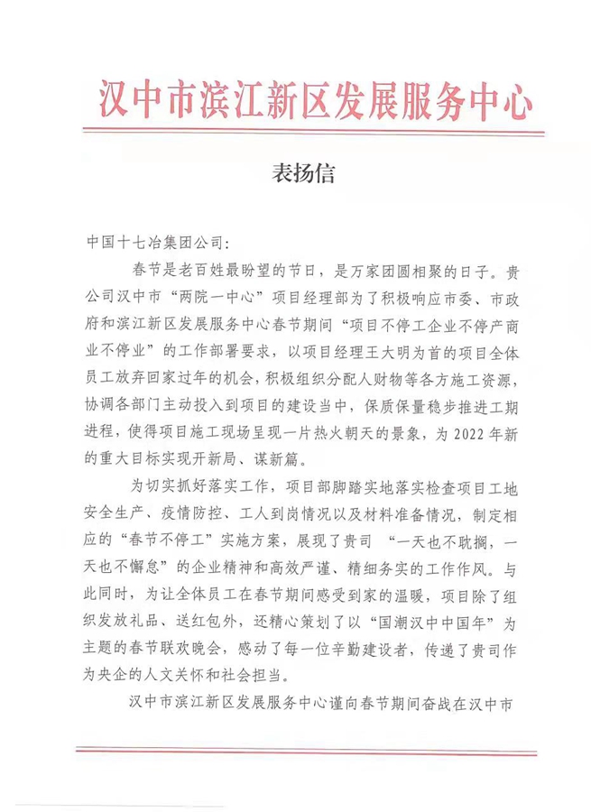 近日,汉中市滨江新区发展服务中心向中国十七冶集团发来表扬信,对公司承建的汉中市“两院一中心”项目全体员工在春节期间放弃与家人团聚的宝贵时光,主动投身项目建设给予充分肯定和高度赞扬。