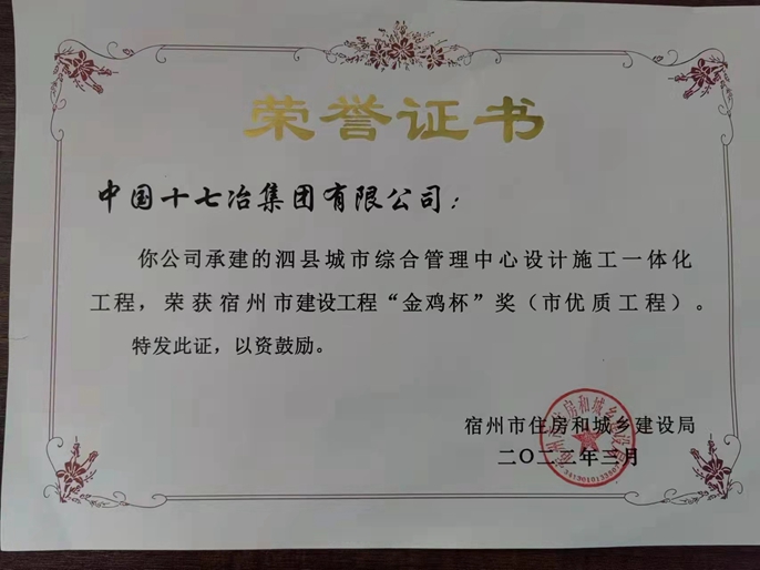 3月30日,宿州市住建委向2021年度宿州市建设工程“金鸡杯”工程获奖单位颁发荣誉证书,中国十七冶承建的泗县高铁站片区等三个地块城中村改造EPC项目和泗县城市综合管理中心项目位列其中。