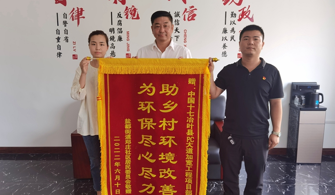 6月10日上午,中国十七冶集团公路分公司河南叶县PC大道项目部收到叶县盐都街道郑庄社区赠送的“助乡村环境改善,为环保尽心尽力”锦旗,对项目部组织进场施工以来的环保管理工作所付出的努力表示诚挚的感谢。