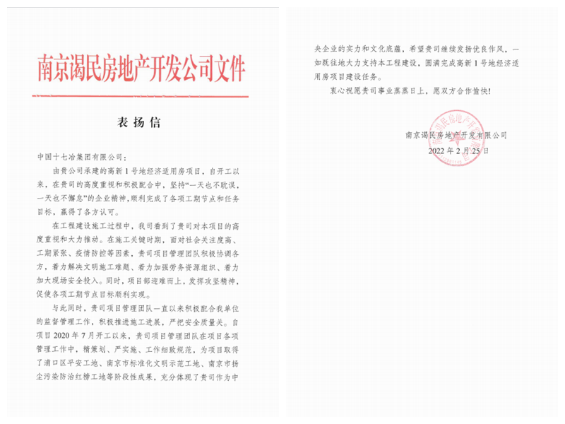 6月13日,南京谒民房地产开发有限公司向中国十七冶集团有限公司江苏分公司浦口高新1号地项目致表扬信,对项目团队顺利完成各项工期节点和任务目标表示肯定和感谢。