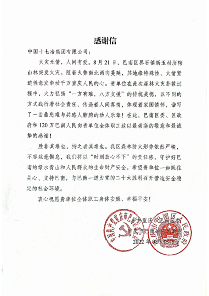 9月15日,受巴南区政府委托,重庆市渝兴建设投资有限公司总经理任良平一行将一面印有“逆火驰援急先锋 抢险救援真英雄”的锦旗及感谢信送至十七冶重庆软件与信息服务外包产业园项目部,对项目部在今年8月积极参与扑救重庆巴南区界石镇森林火灾行动表示真诚感谢。