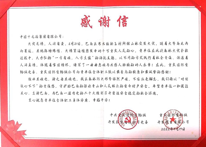 9月26日下午,重庆国际生物城开发投资有限公司将一份沉甸甸的感谢信送到了中国十七冶重庆植恩现代化中药厂房项目,这份诚挚的感谢信凝聚了十七冶员工在灾难面前无畏无惧的勇气和不怕苦的奋斗精神,更是十七冶人坚强品质的见证。