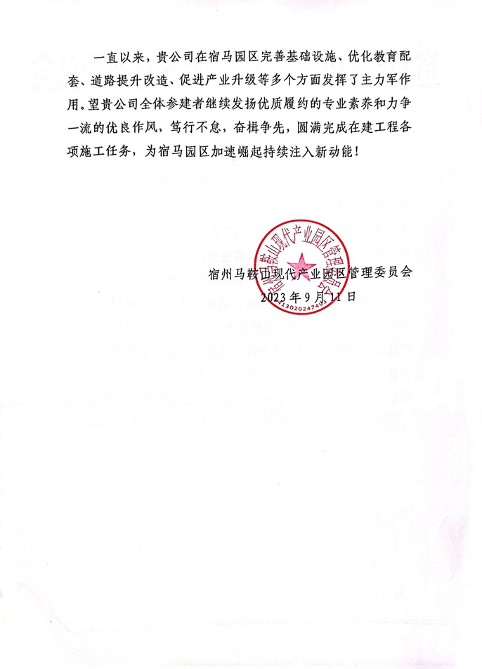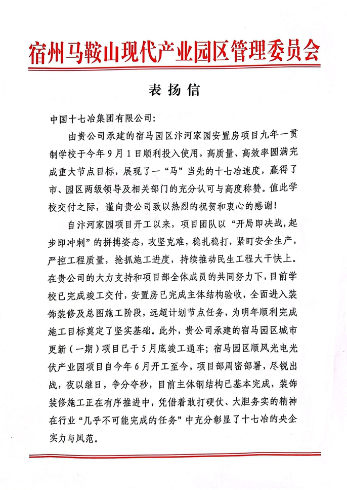 近日,宿州马鞍山现代产业园区管委会向中国十七冶致表扬信,对十七冶宿马园区各项目高效履约,对园区完善基础设施、优化教育配套、道路提升改造、促进产业升级所作贡献表示肯定与感谢。