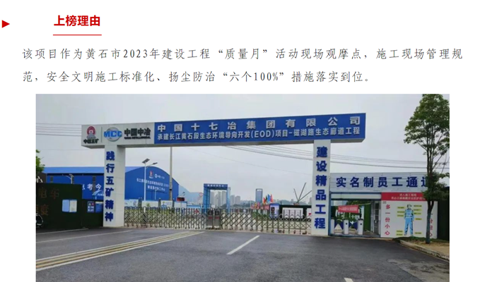 磁湖绿色廊道项目入选黄石市建筑工地“首期争优”红榜