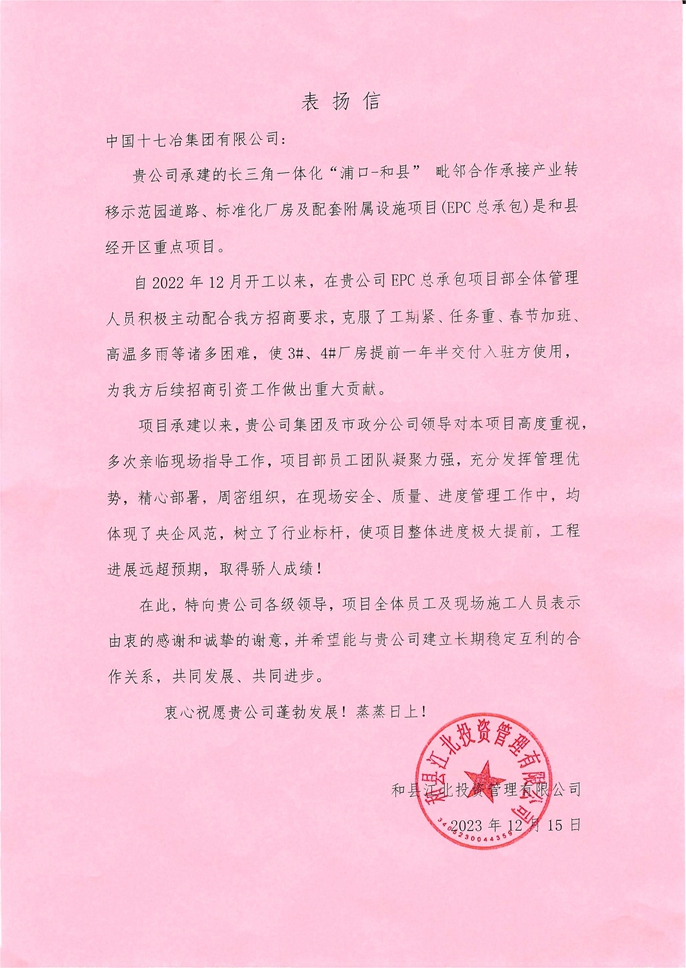 12月15日,和县江北投资管理有限公司向中国十七冶集团致表扬信,对市政分公司和县浦和厂房项目提前一年半完成厂房交付任务表示感谢。