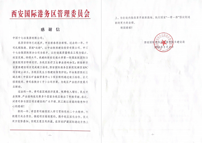 2月2日,西安市国际港务区住房和城乡建设局向中国十七冶集团致感谢信,对中冶陕西建设投资有限公司、中国十七冶集团陕西分公司高标准完成年度任务表示衷心感谢。
