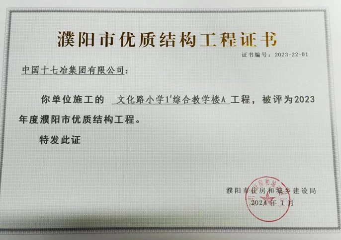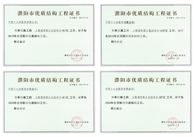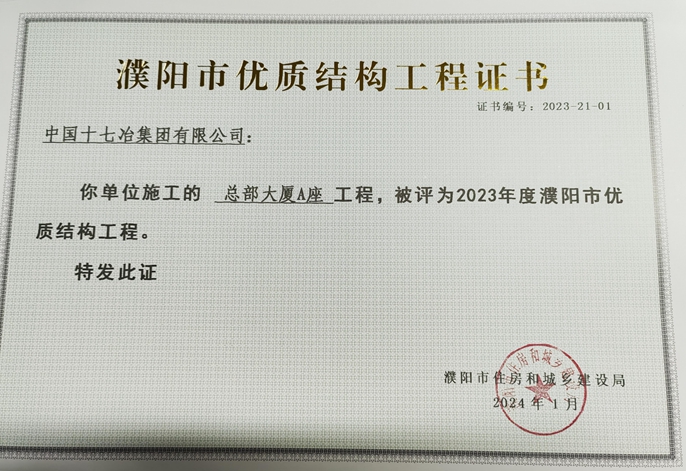 近日,从濮阳市住房和城乡建设局获悉,中国十七冶冶金分公司承建的濮阳大数据智慧生态园、总部大厦A座、文化路小学3个项目获评濮阳市2023年“优质结构工程”。