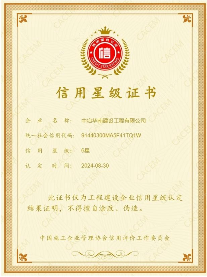 9月3日,中国施工企业管理协会公布2024年第七批信用星级认定结果名单,中冶华南在原有基础上信用星级评定再增一星,荣获信用星级“6星”荣誉,这也是中冶华南连续两年获得信用升级。