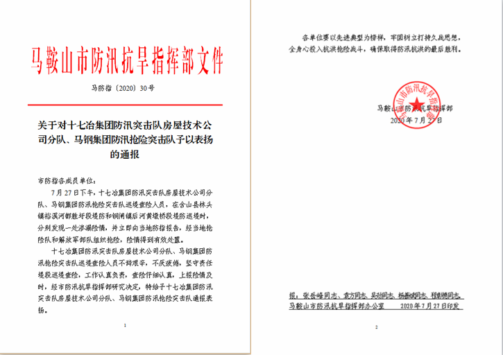 7月27日,马鞍山市防汛抗旱指挥部发布通报,表扬中国十七冶集团房屋工程技术分公司防汛突击队在防汛抢险之余,加强巡查排险,牢牢守住防汛第一线,及时传递险情信息,为全方位确保河堤安全,及时转移避险,高效应急处置争取了时间、提供了保障,充分体现了中国十七冶集团坚守履职、勇担使命的央企精神。