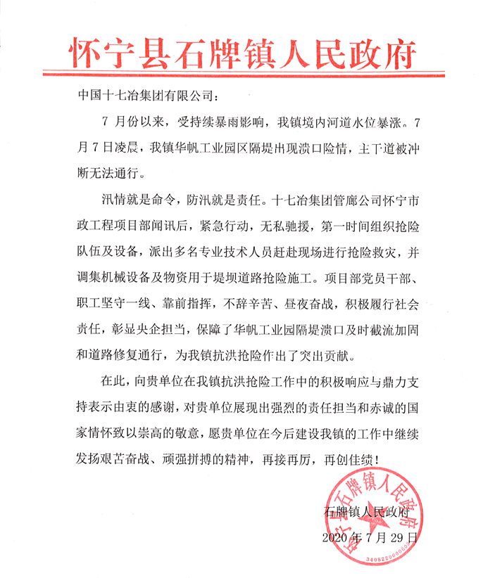 8月6日,中国十七冶集团收到安徽怀宁县石牌镇政府发来的感谢信,对公司在当地抗洪抢险工作中的积极响应与鼎力支持表示衷心感谢,并致以崇高的敬意。